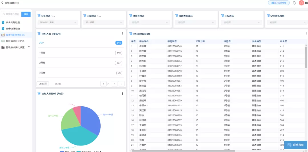 可進行宿舍信息化展示,涵蓋公告通知、通報批評,學生宿舍請假,學生入、退、調、留宿申請、設備報修、日常衛生/紀律評比等,通過收集學校宿舍管理的各項指標數據,來指導學校宿舍管理工作,提升學校宿舍管理水平。