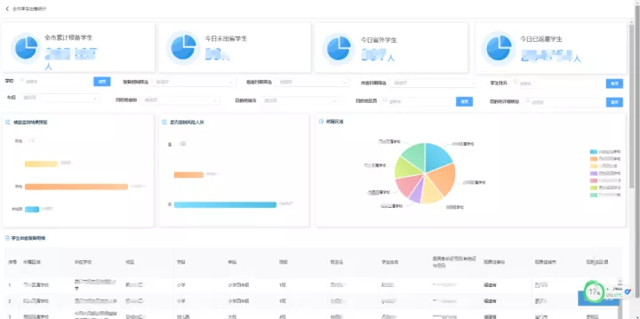 對全市師生出省情況進行精細化跟蹤,師生在外狀態、交通工具、途徑地、返回情況等一目了然,并且進行市、區、校、班四級進行數據查詢和統計,實現全域軌跡可追溯。