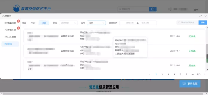 為及時掌控健康碼異常、密切接觸者、重點關注人群等異常情況,教育局/學校借助疫情防控系統,通過對相關人員的各類數據挖掘,自動識別潛在風險,實現前置風險管理。