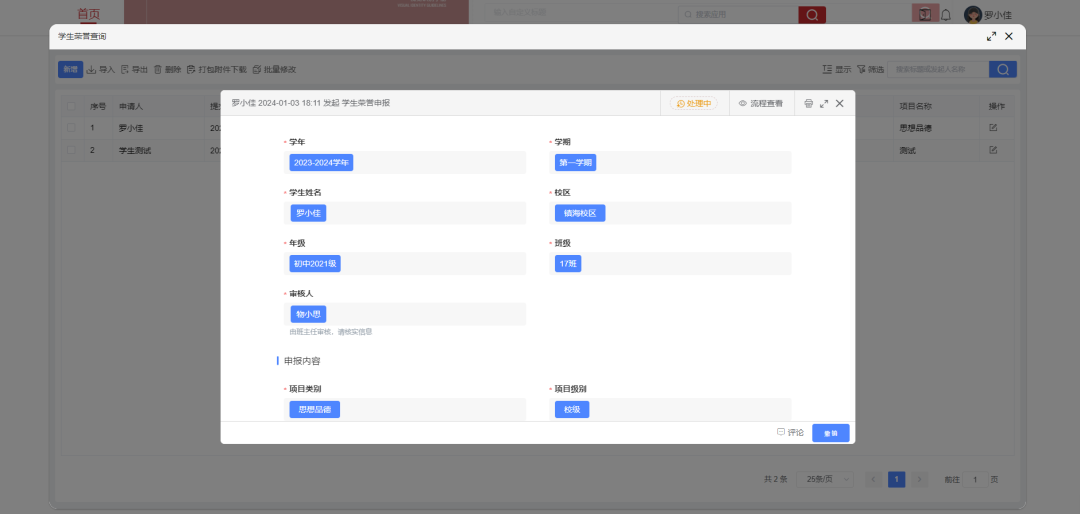 學生端:學生根據自己特長,進行學生榮譽、實踐、創造發明、競賽類等申報,并可在后臺進行申請查詢,查看審核狀態。