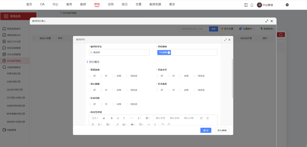 教師評價:老師可在系統中對學生的思想品德、學業水平、身心健康、藝術素養、社會實踐情況進行評價, 并寫綜合性評語。教師評價支持批量導入,支持對學生評語再次編輯。