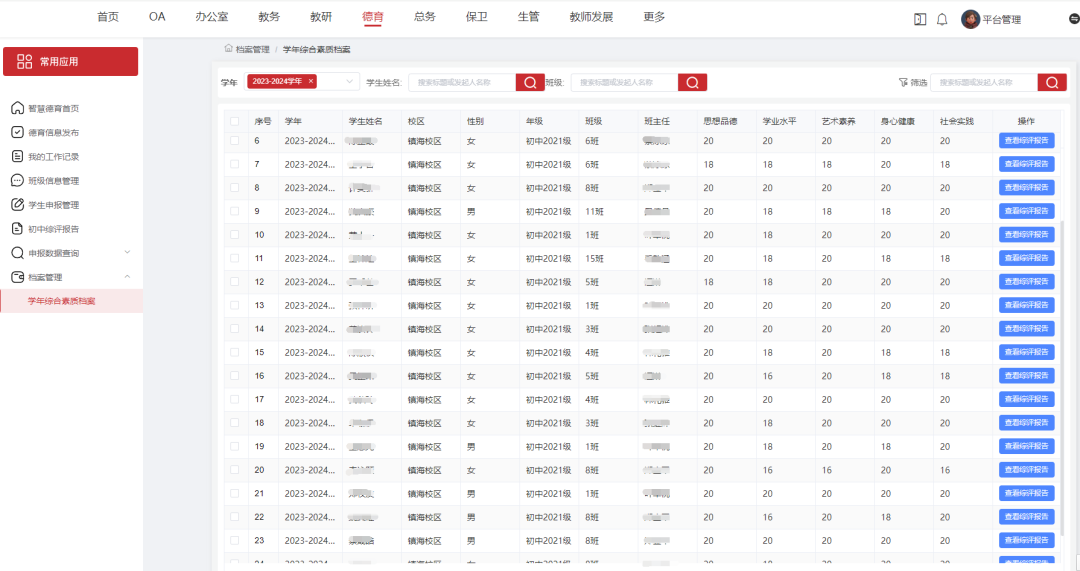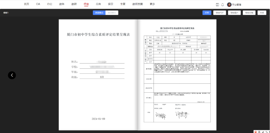 系統會自動生成學生綜合素質檔案,教師可查看每個學生的綜合素質評價報告并推送給學生家長,系統支持打印及導出。