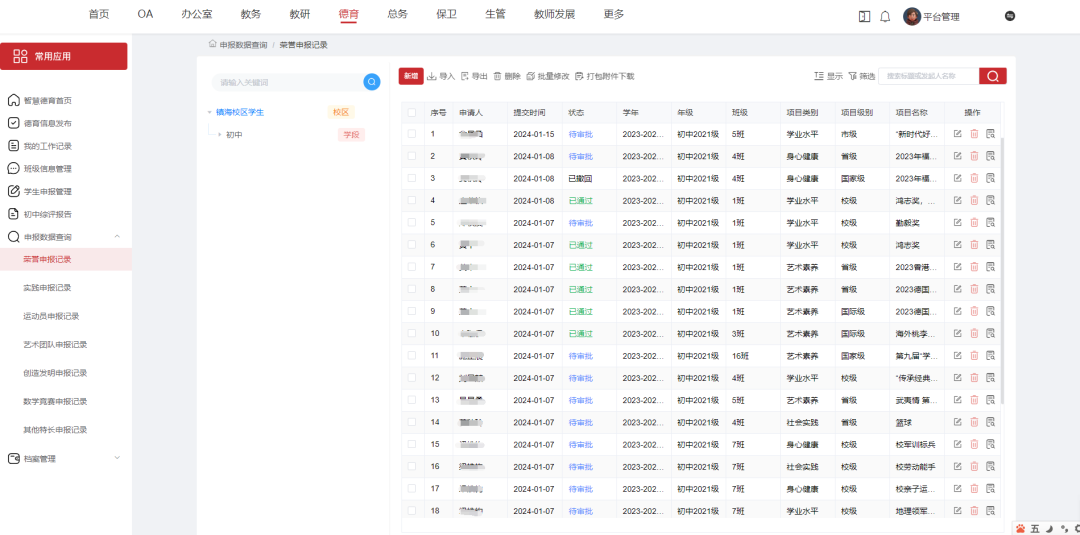 教師端:對學生的體測運動、藝術活動、創造發明、社會實踐、榮譽、各類競賽等進行數據采集。班主任可以對學生提交的申報材料進行審核。學生提交的數據及審核狀態一目了然。